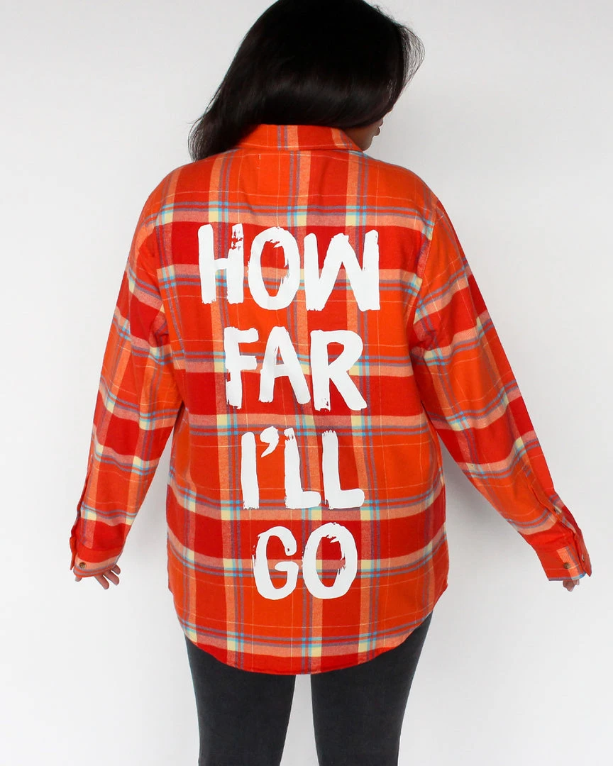 We are so excited to add another Disney Princess flannel to our roster— Moana. Inspired by her outfit, this flannel features embroidered details of Moana’s signature on the collar, Pua on the front pocket and Hei Hei popping OUT of the pocket. On the back you’ll find printed details of her quote ‘How Far I’ll Go’.