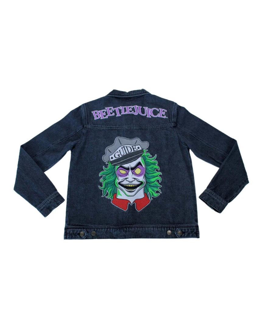 For Cakeworthy and Beetlejuice fans alike, this jacket is the perfect spooky addition to your wardrobe. Featured you’ll find Beetlejuice’s signature graveyard sign on the front, and the movie logo and art of Beetlejuice himself on the back—all in embroidered details!