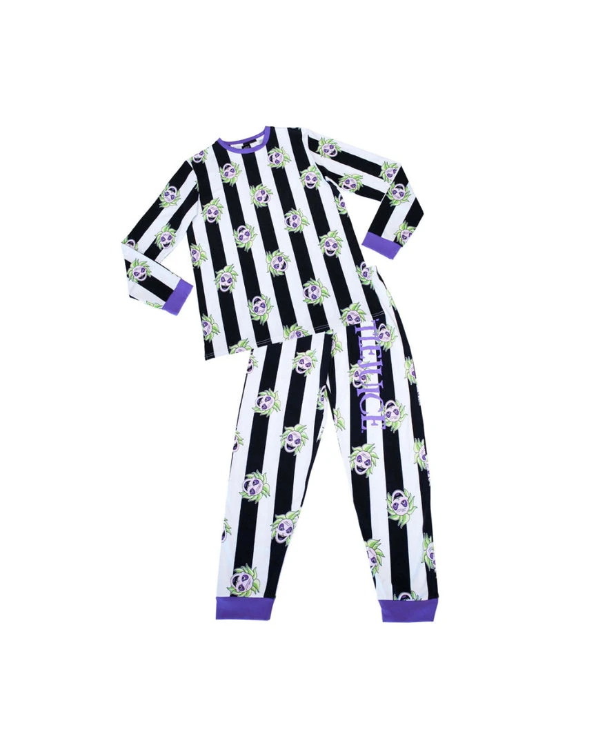 Beetlejuice takes a cute twist in this cozy PJ set! Inspired by this very own outfit, this PJ set features adorable printed artwork, the movie logo down the left leg, and an extremely comfortable and stretchy fit that is truly to die for.