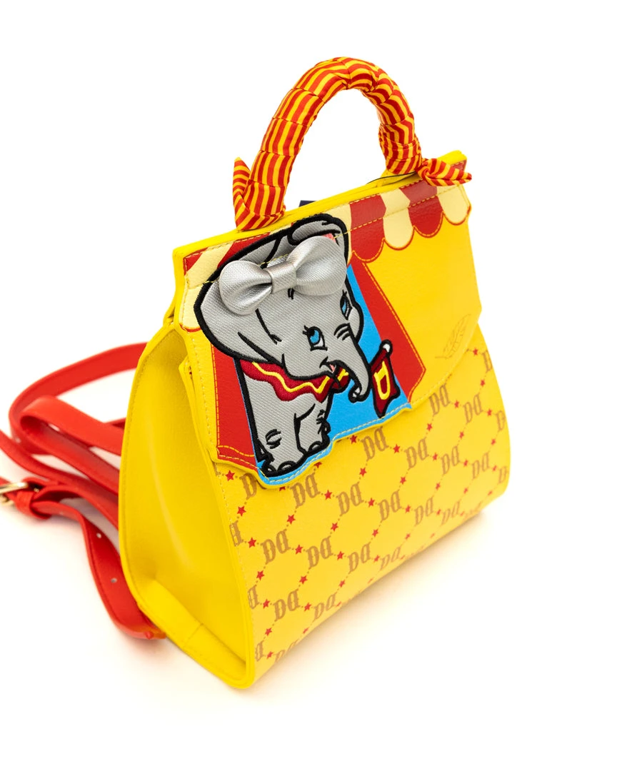 custom monogram backpack. Designed with a primary color scheme and including hints of circus details, the front flap features adorable Dumbo holding a flag with his signature “D” and a 3D bow on his ears. This backpack has a yellow pebble base, a red and yellow scarf wrapped handle, and metallic and embroidered accents. Not only cute but also functional, this bag has adjustable backpack straps, and an interior back wall pocket and front interior pocket. Carry all your essentials and share your love for this sweet elephant!