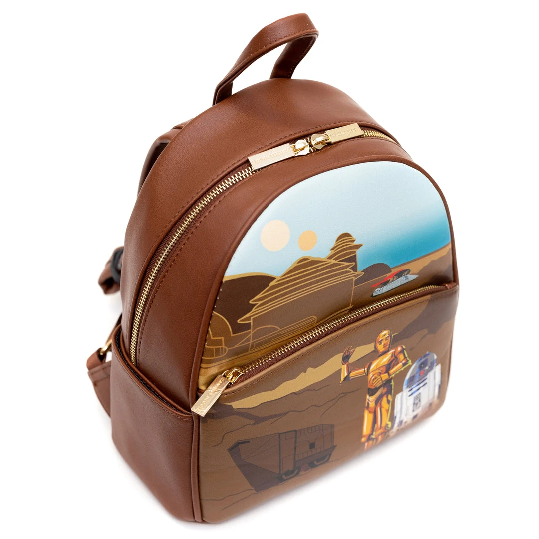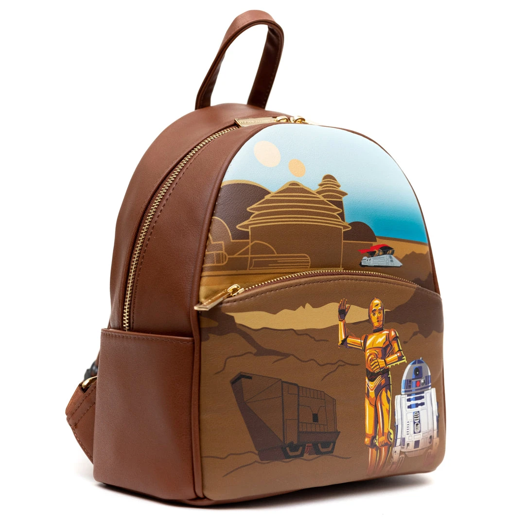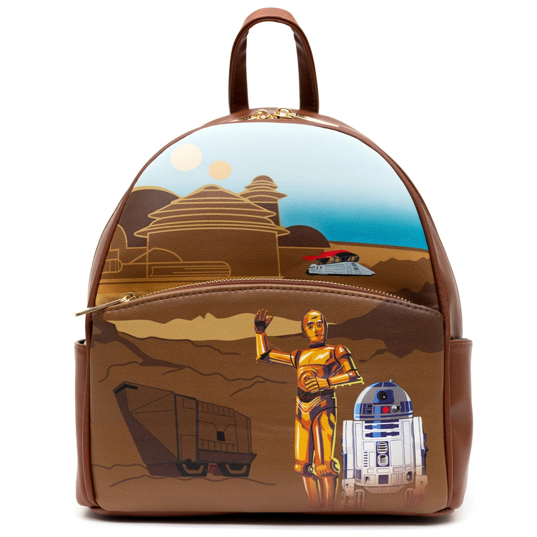- You’re going to love this cute backpack featuring Star Wars Droids C-3PO and R2D2. This mini backpack features include sturdy gold toned metal hardware, adjustable straps, side pockets, and is made of vegan leather (polyurethane)
