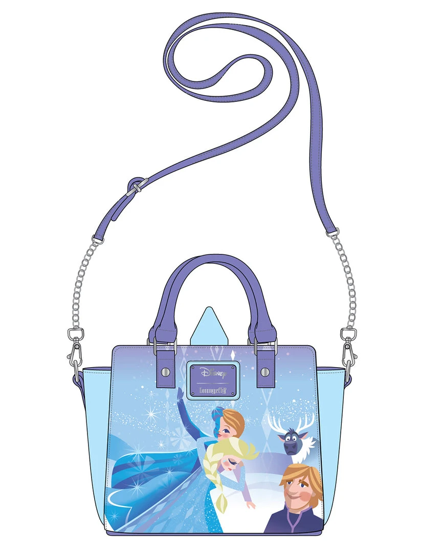 Glide along a shimmering frozen wonderland with Olaf on this Frozen Princess Elsa Castle Cross Body Bag. On the front of the bag, Olaf slides on the ice in front of the palace, which reaches up and over the top of the purse and glimmers with iridescent silver foil details. On the back, Elsa, Anna, Kristoff, and Sven make an appearance. This accessory complements any Disney outfit and is perfect for fans who are looking to keep their favorite animated moments close.
