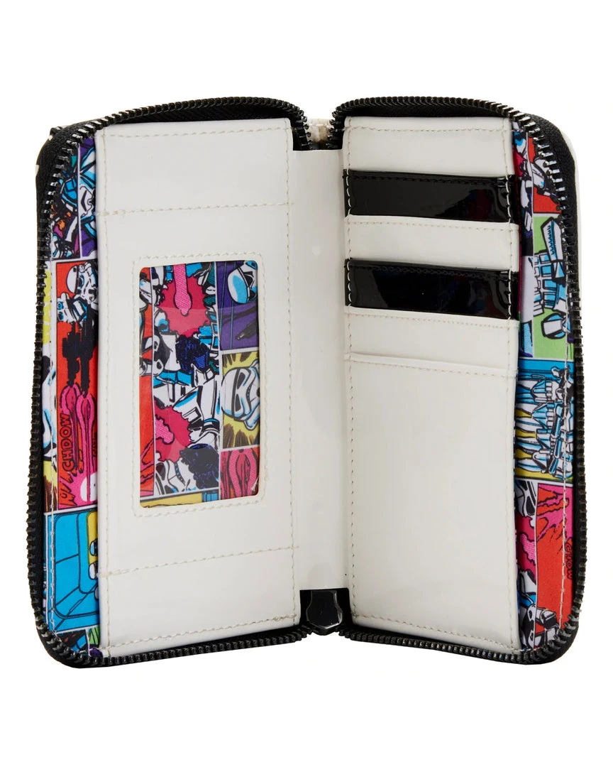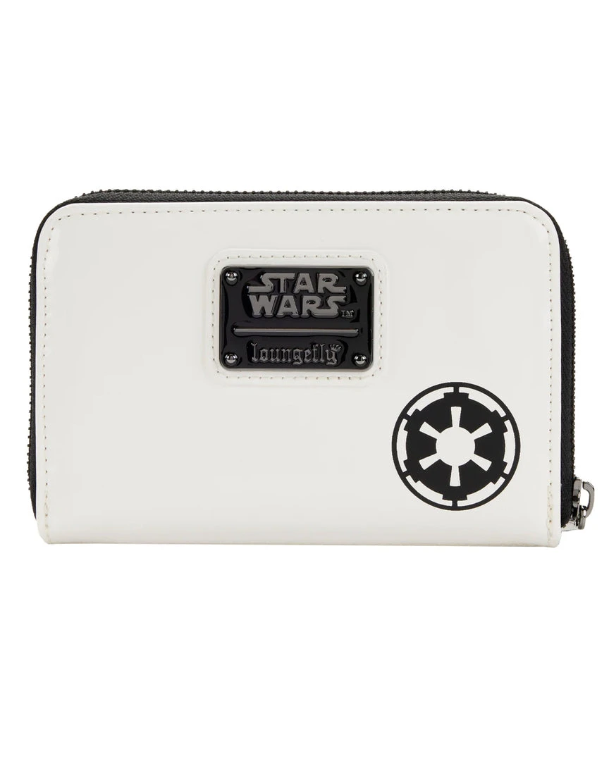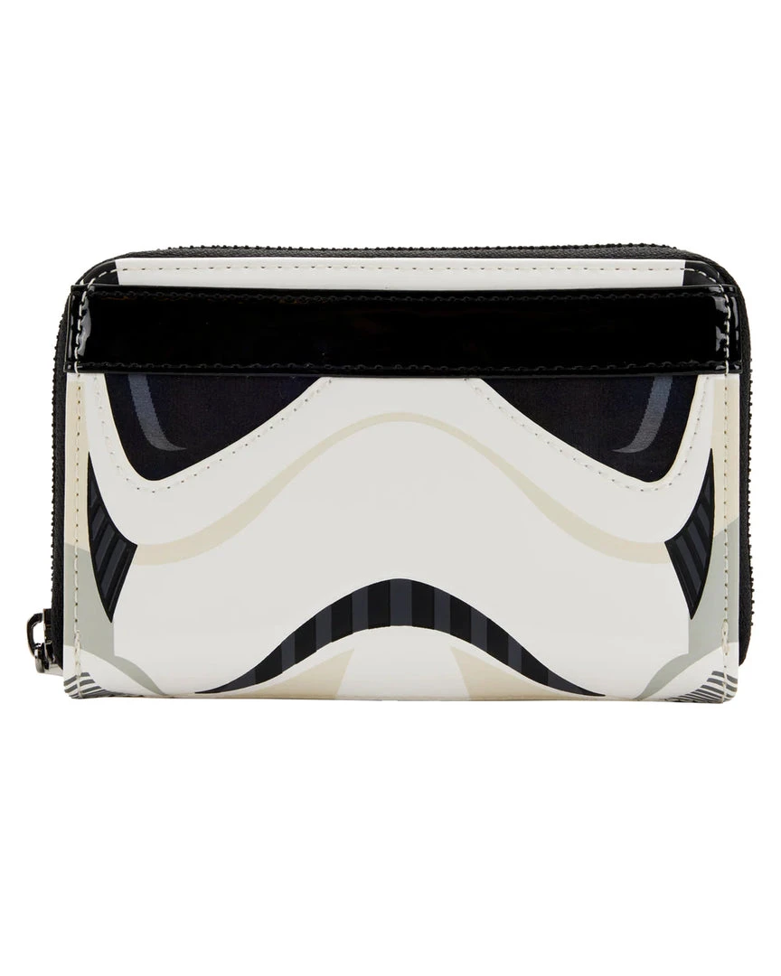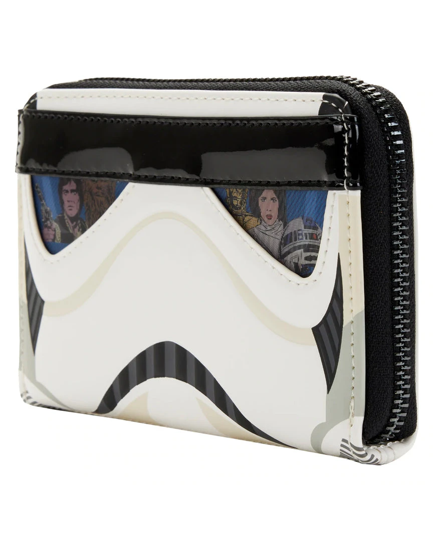 Blast through your day with the help of a Star Wars Stormtrooper and this Stormtrooper Lenticular Cosplay Zip Around Wallet. The unmistakable Stormtrooper’s white helmet appears on the front of the wallet. A lenticular screen, placed in the eyewear of the Stormtrooper, reveals an alternate view of Hans Solo, Chewbacca, and Princess Leia. An embroidered Stormtrooper symbol appears on the back.