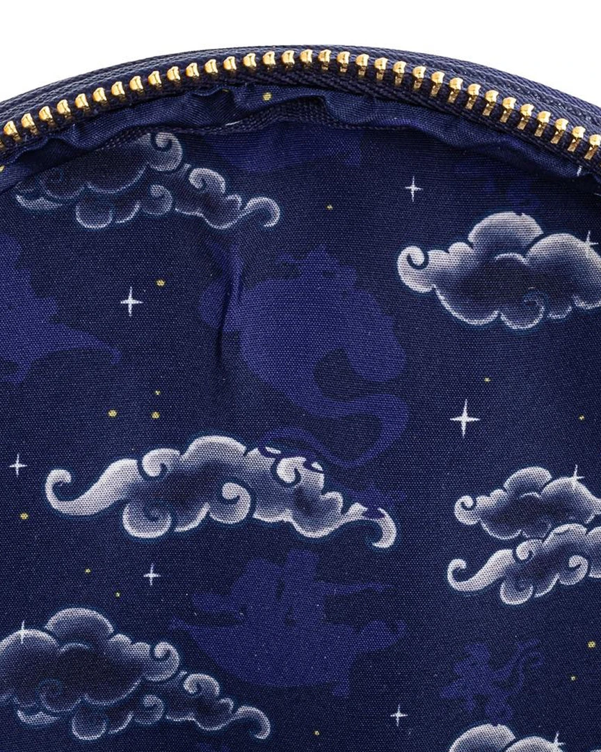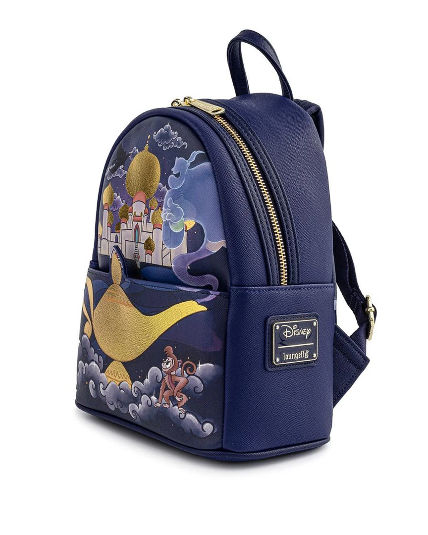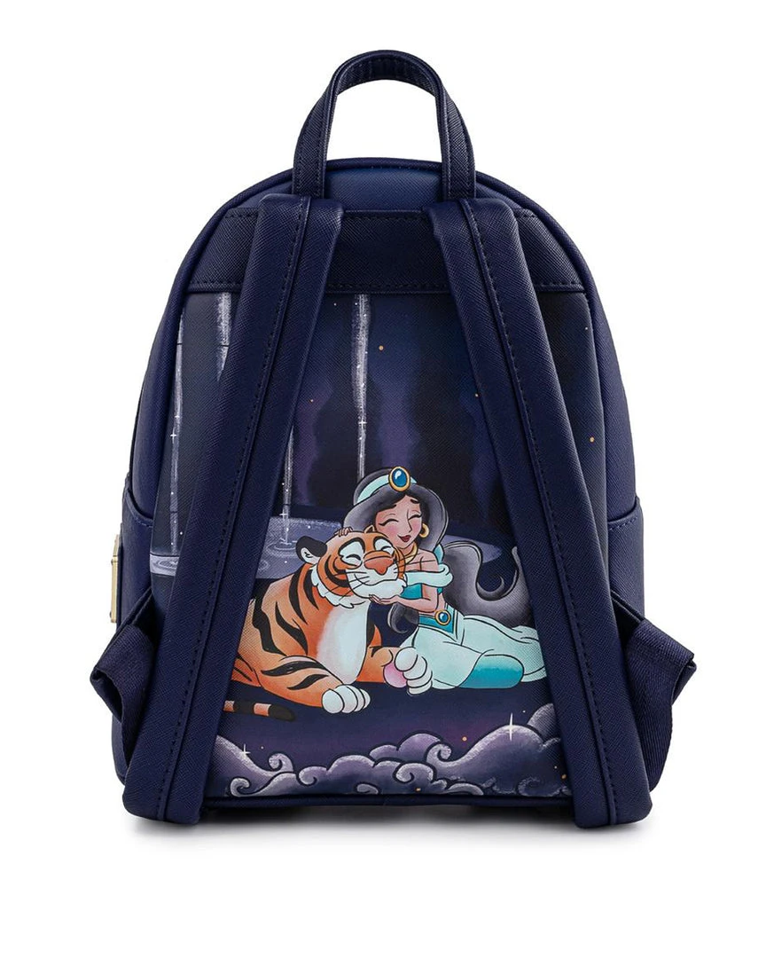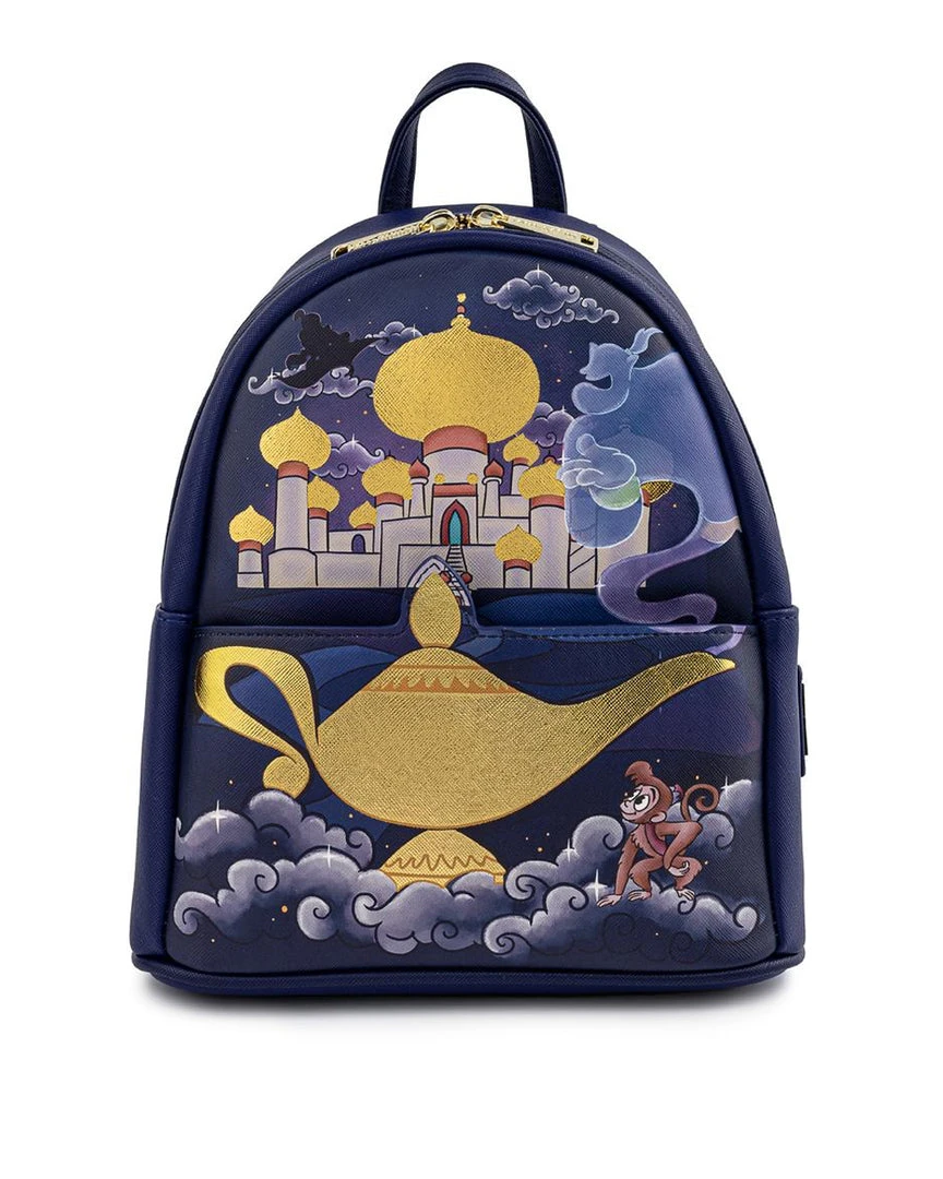 Admire the beauty and wonder of the Sultan’s Palace in Agrabah! The Loungefly Disney Aladdin Princess Jasmine Castle Mini Backpack features dark and dreamy purples with the gold palace rooftops and Genie’s lamp standing out with foil details and eye-catching relief. On the back you’ll find Jasmine and Rajah too! There’s no need to go on a magic carpet ride or embark on a treacherous adventure in order to collect this amazing accessory for your Disney collection.