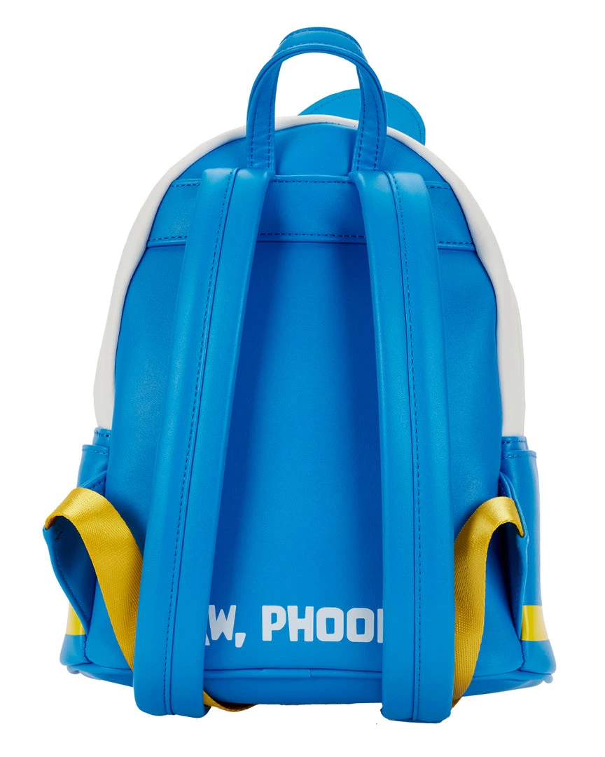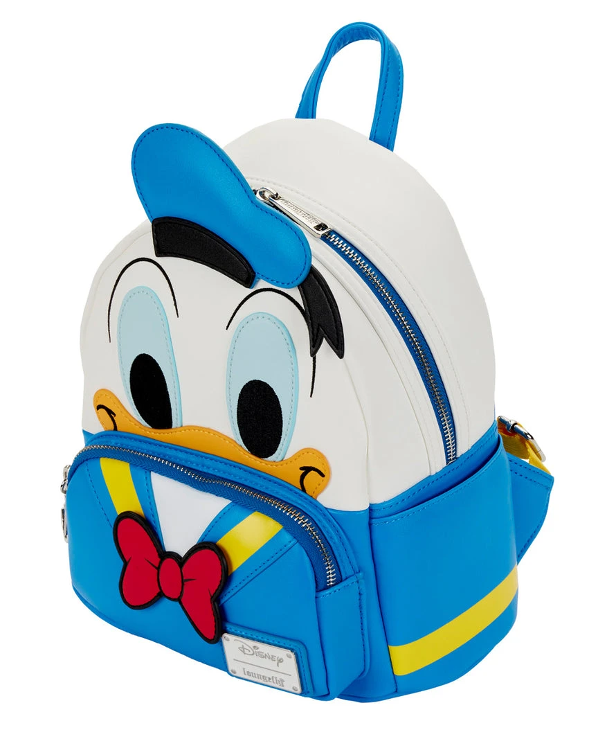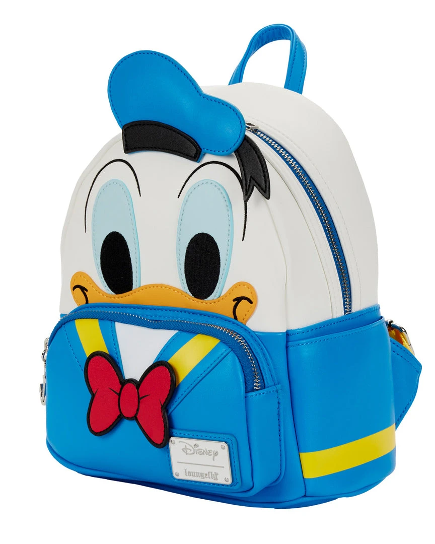 Donald Duck is coming in for a landing to ride with you on your next adventures with this Donald Duck Cosplay Mini Backpack. On the front of the bag, Donald Duck’s face peeks out over the front zipped compartment, which is accented by a bright red bow, with 3D details. The message on the back reads “Aw, Phooey!” This backpack is a great accent for any Disney outfit.