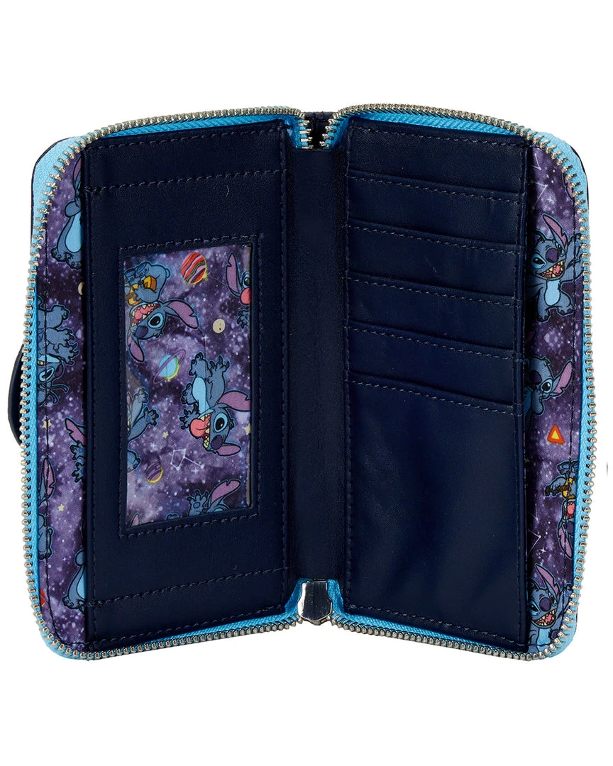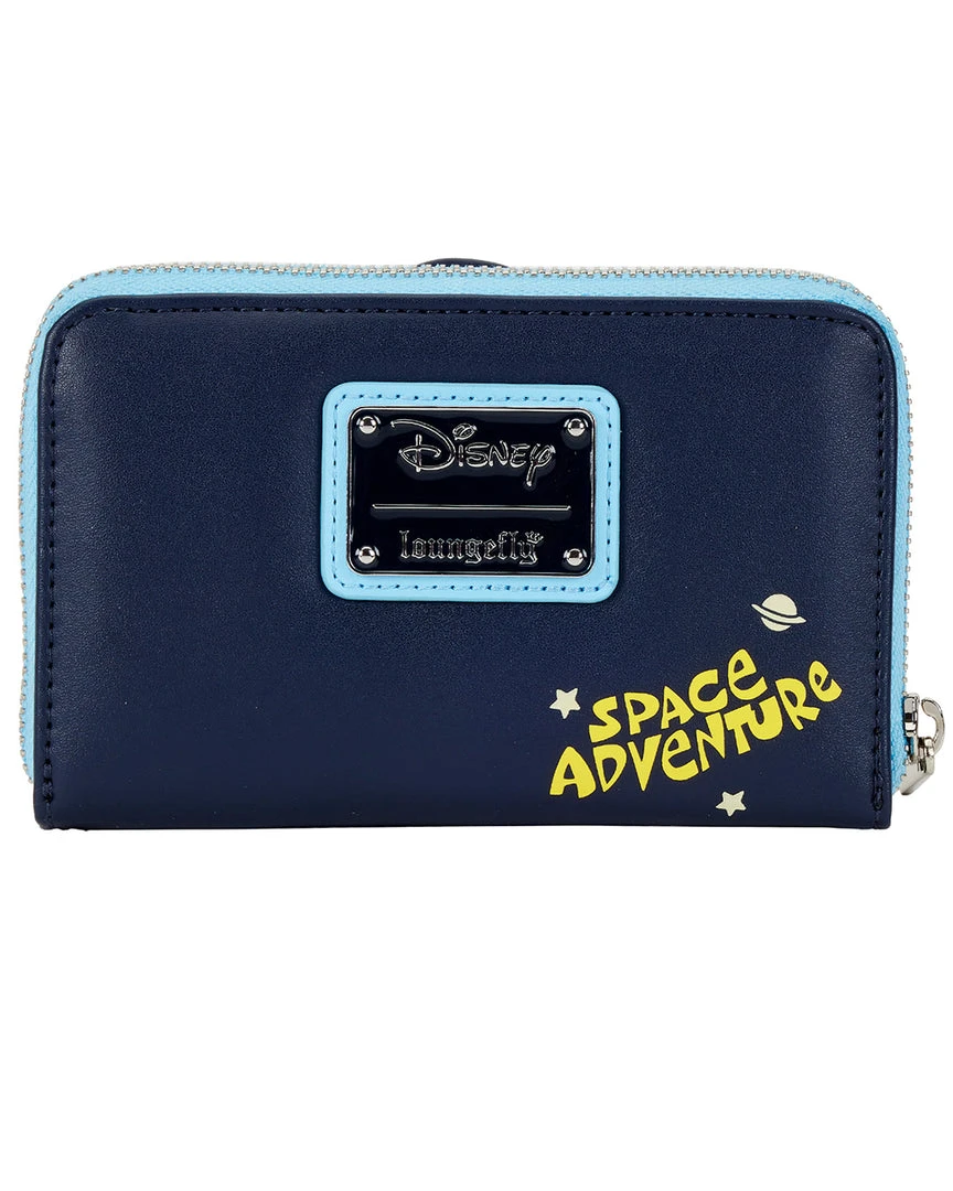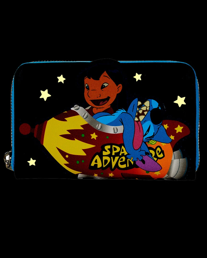 A coin-operated rocket ride provides out-of-this-world adventure for the imaginative duo, Lilo and Stitch. Have a blast taking them with you as this Lilo & Stitch Space Adventure Glow in the Dark Zip Around Wallet. On the front of the wallet, Lilo and Stitch have managed to fly to outer space in the coin-operated “Space Adventure” rocket ship. Even the stars around them glow in the dark! Lilo is having too much fun to notice that the ride might be a bit much for Stitch to handle. On the back side, planets and stars surround the words “Space Adventure.” In fact, the star and planet also glow in the dark.