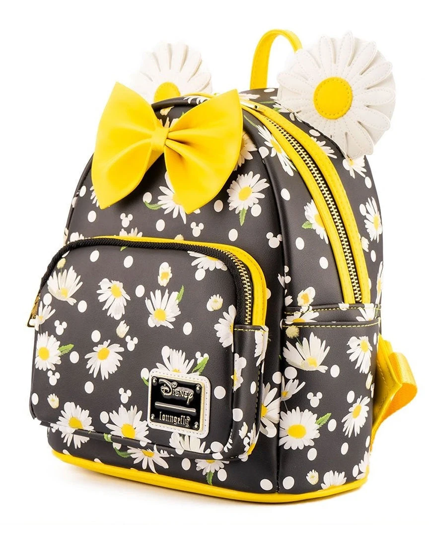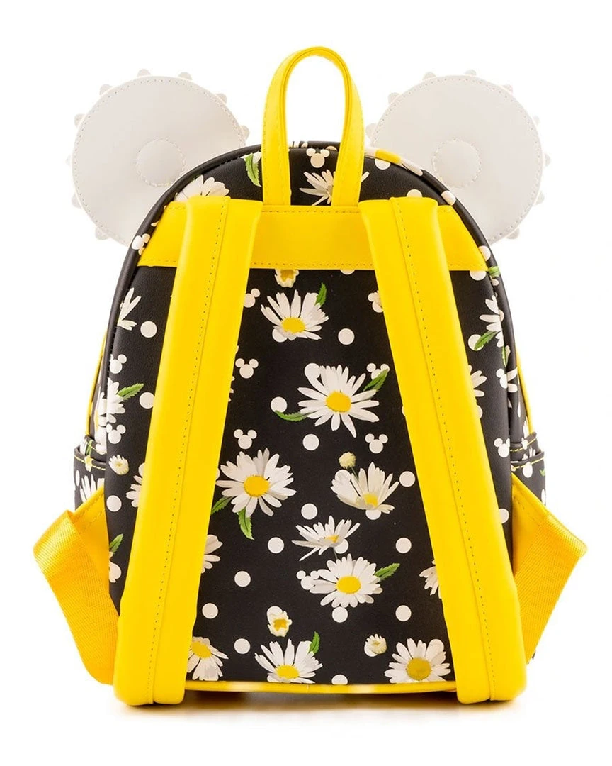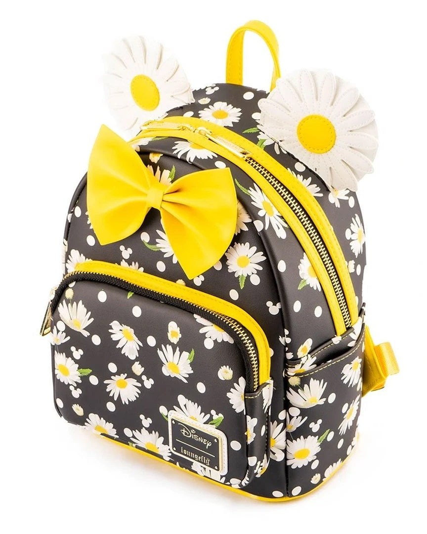 Get ready for spring with the Minnie Mouse Daisy Mini Backpack! The white daisies and polka dots stand out against the black background, adding a bright yellow zest to spring or even summer outfits. Between the daisy covered ears is a bright yellow bow, tying together the whole look. This bag will help you brighten the new year!