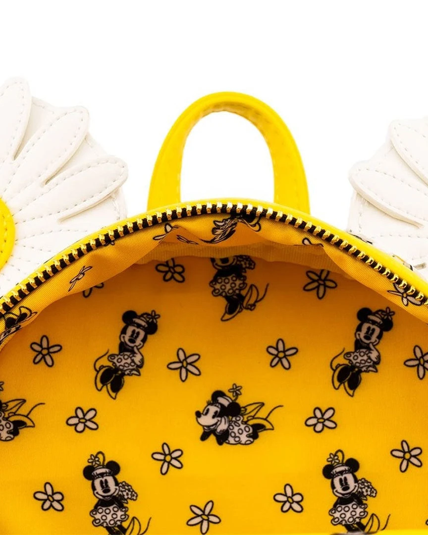 The Loungefly Minnie Mouse Daisy Mini Backpack is made of vegan leather (polyurethane). Bag has adjustable shoulder straps, sturdy metal hardware, and features: applique, and printed details. Take note of the coordinating pattern of the inside lining fabric. Please note: Patterns will vary with all-over-print styles. Not every piece will look identical nor will every piece be an exact match as to what is pictured online. This backpack is an officially licensed Disney product.