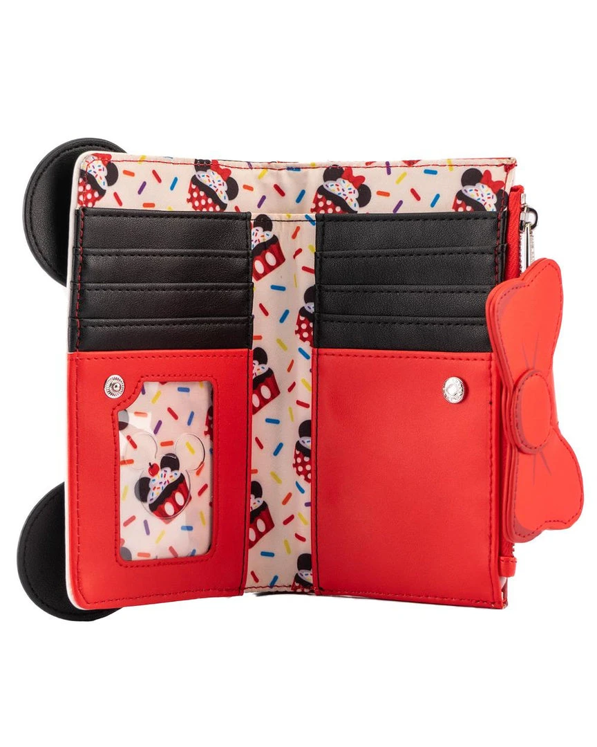 The Disney Minnie Mouse Sprinkle Cupcake Cosplay Flap Wallet is made of vegan leather (polyurethane). Wallet snaps closed, has a zipper pocket and sturdy metal hardware, and features: applique, embroidered, and printed details. Take note of the coordinating pattern of the inside lining fabric.