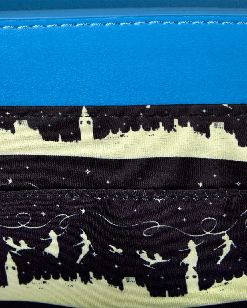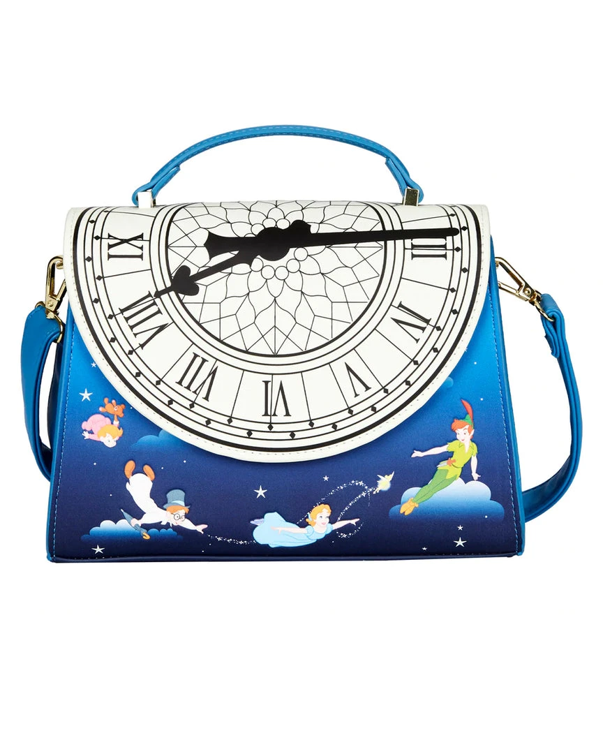 Tink’s pixie dust has set the wheels in motion. Peter Pan will whisk the Darling children away to Never Land. Hang on tight to witness this scene up close with this Peter Pan Glow Clock Glow in the Dark Crossbody Bag. On the front of the bag, Peter Pan, Wendy, Michael, Tinker Bell, and John fly right past Big Ben.