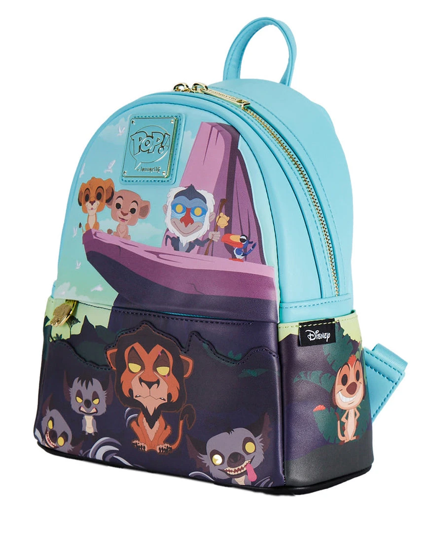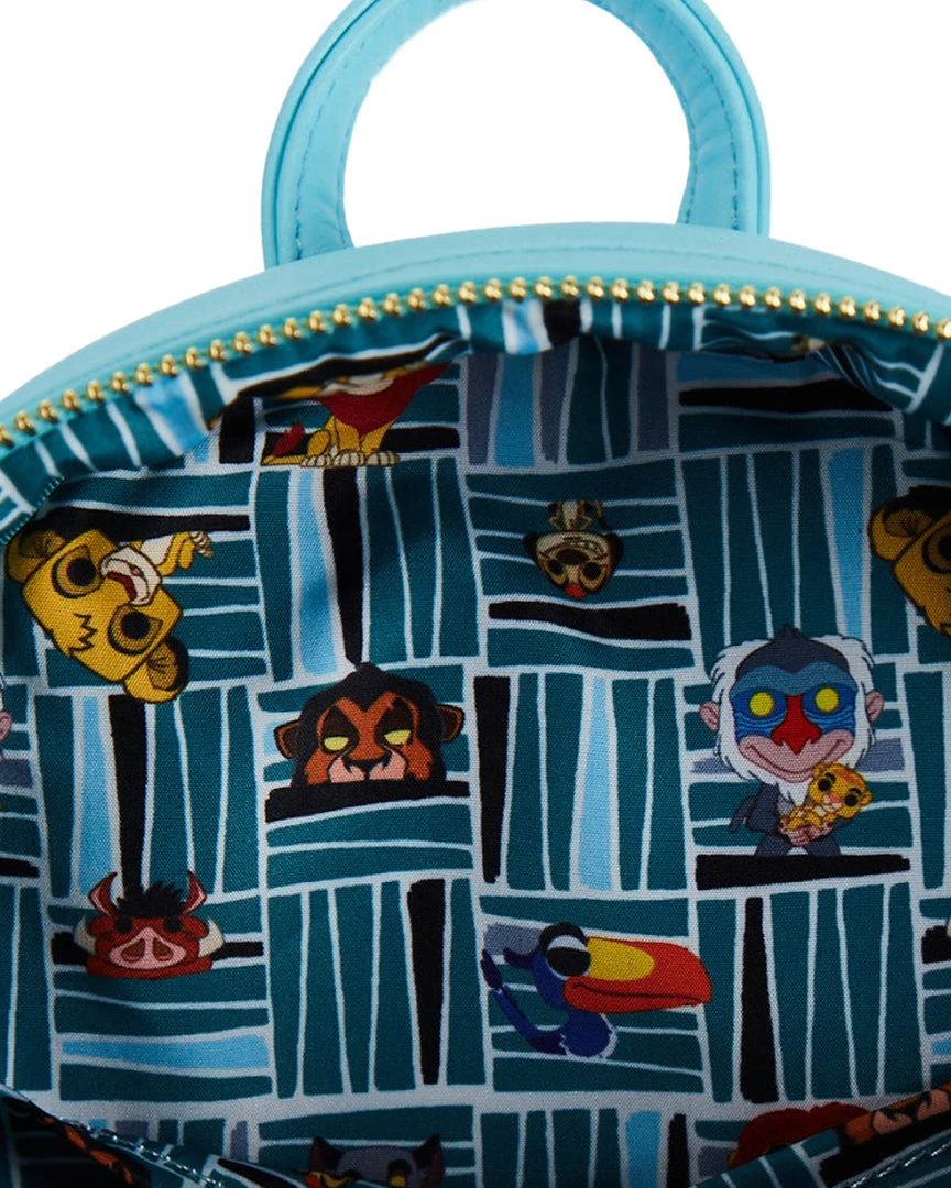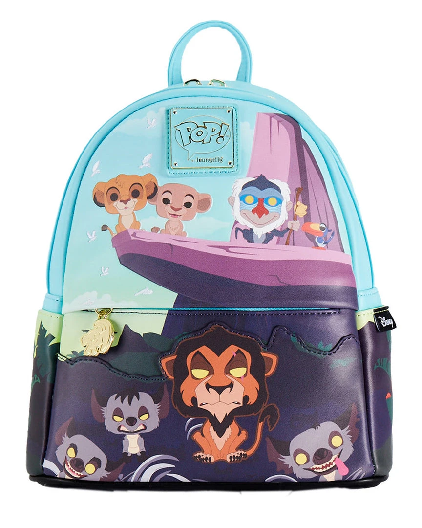 Circle back around to Pride Rock and take the adventures of the Pride Lands with you with this Funko Pop! by Loungefly The Lion King Pride Rock Mini Backpack. On the front of the backpack, young Simba and Nala stand on Pride Rock, with Rafiki watching in the background. Below, Scar and hyenas gather to stand guard over the zipped compartment. On the back, young Simba makes another appearance. Note the coordinating inside lining. This backpack is the perfect accessory to complement any Disney outfit.