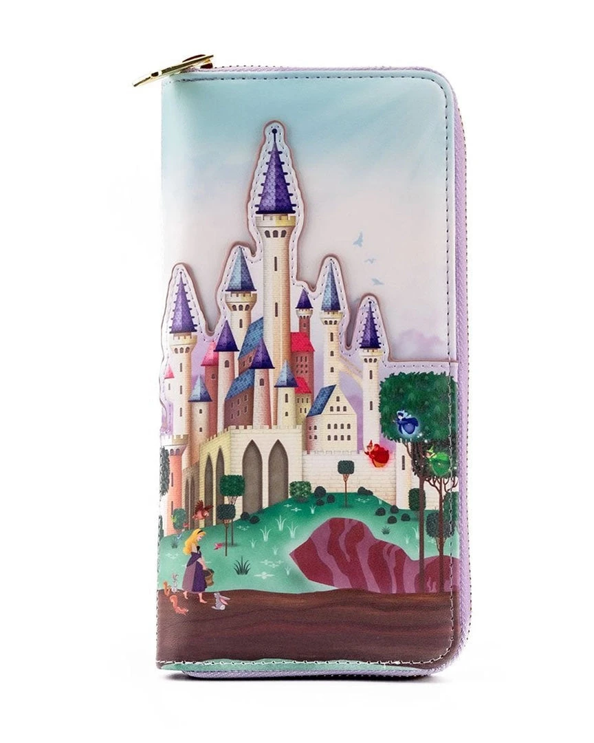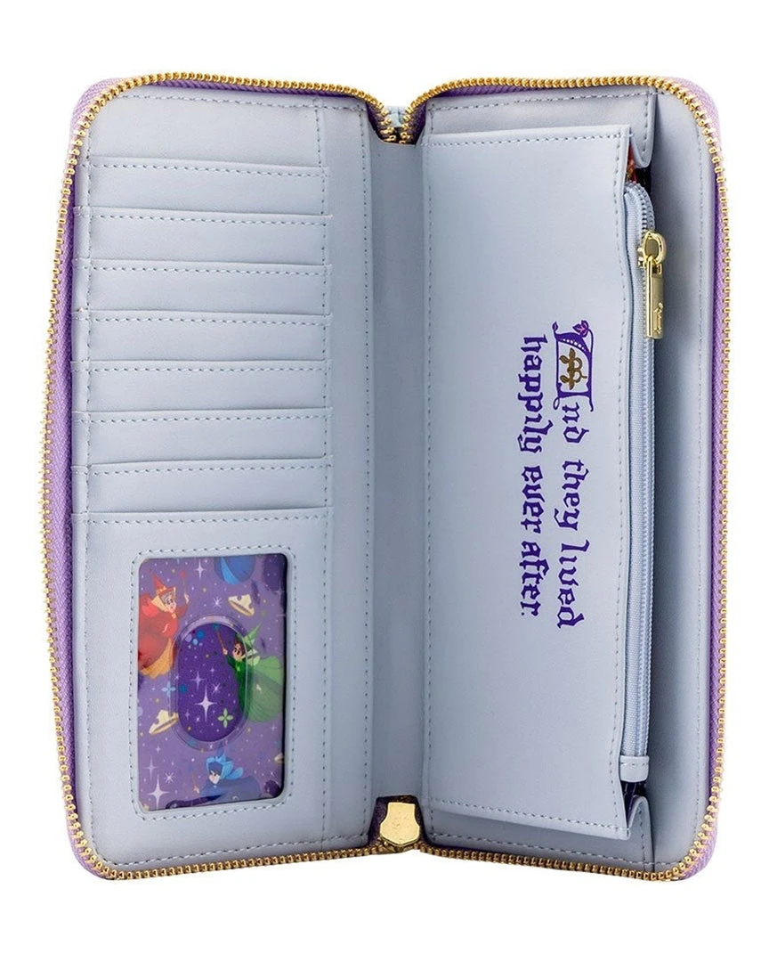 Live happily ever after with this Loungefly Disney Sleeping Beauty Castle Zip Around Wallet. Since 1959, Disney’s Sleeping Beauty has enchanted audiences with the possibility of “love’s true kiss.” Spells can be broken, with just a little fairy dust, and the interior lining of this wallet carries a magical fairy godmother motif for safekeeping.