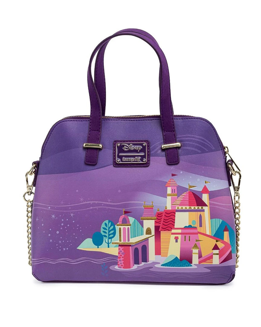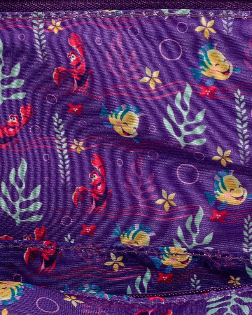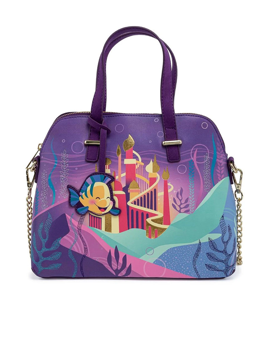 Carry the vibrant and beautiful sights of Ariel’s undersea castle and seaside castle as the Loungefly Disney The Little Mermaid Ariel Castle Crossbody Bag. The pattern depicts King Triton’s underwater castle, while on the back is Prince Eric’s castle is just off the shore. Flounder tags along as a faux leather charm. This bag is a great accessory to vibrant summer outfits and perfect for everyday use.