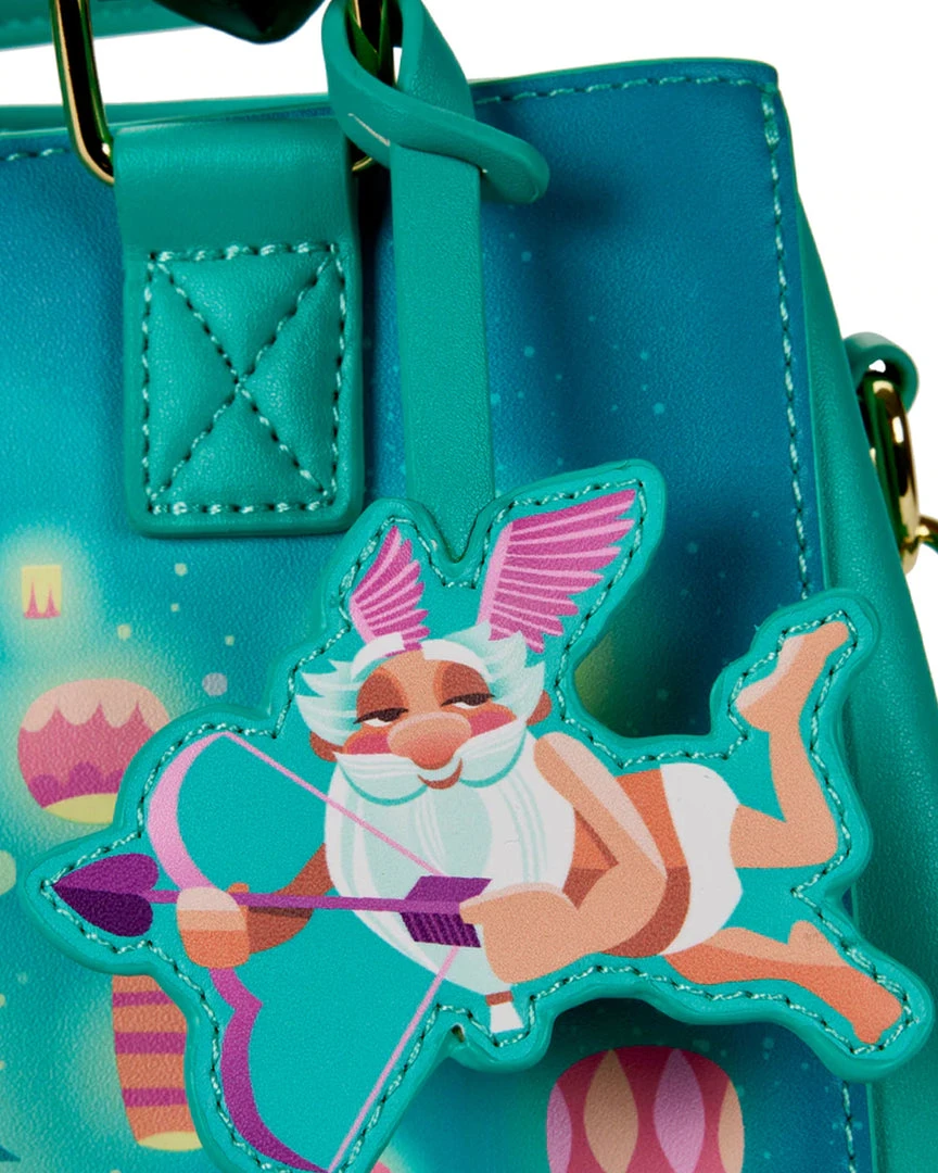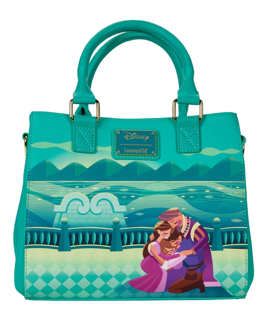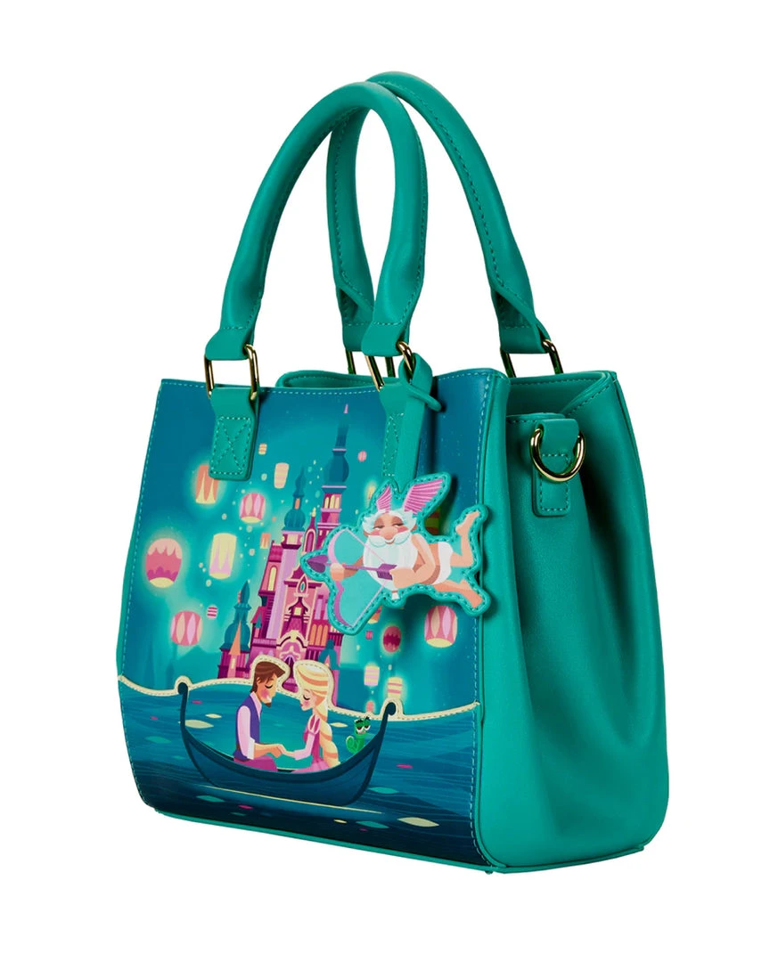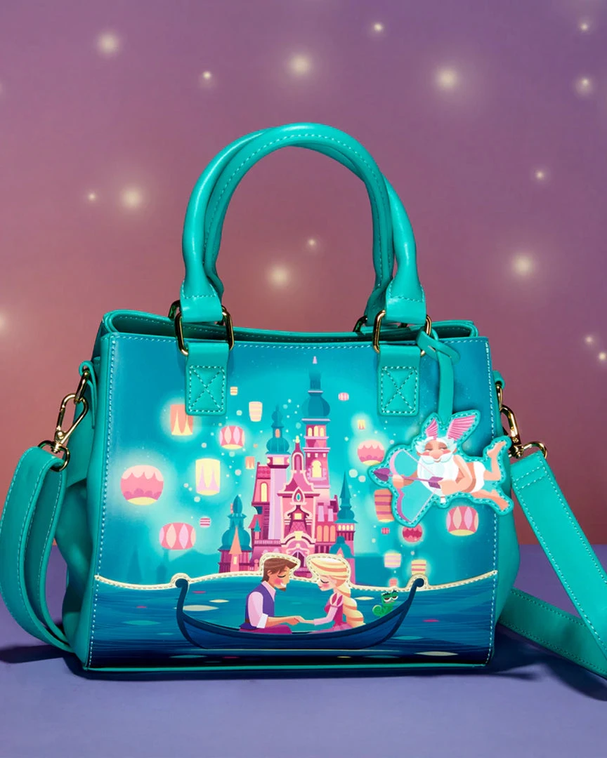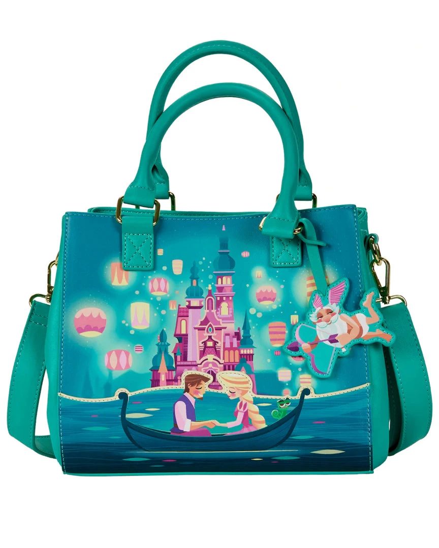 The front of the bag shows the moment when Rapunzel and Flynn take a gondola ride on Rapunzel’s birthday so that she can see the illuminations up close. Lanterns light up the sky in this magical scene, and the castle glows in the background. In fact, the lanterns and windows have glow-in-the-dark details. A vegan leather cupid charm completes the scene. On the back, the entire family embraces to celebrate Rapunzel’s return.