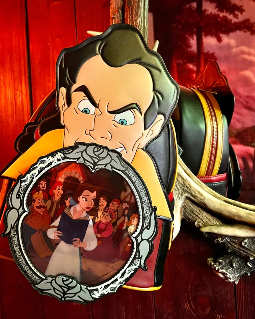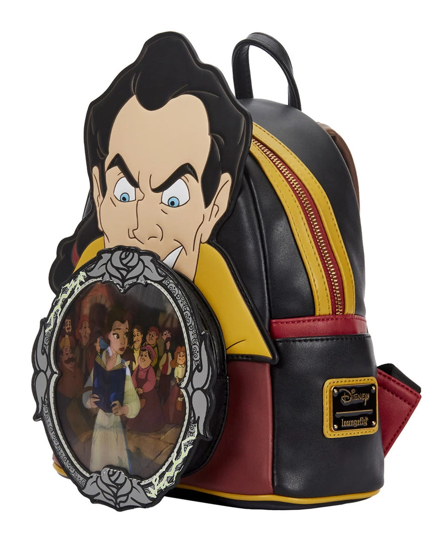 Backpack features include adjustable shoulder straps, antique gold hardware, side pockets, and applique, debossed, lenticular, and printed details. The exterior is fashioned from vegan leather (polyurethane). Note the lining, which carries a red and gold motif of Gaston showing off his biceps.