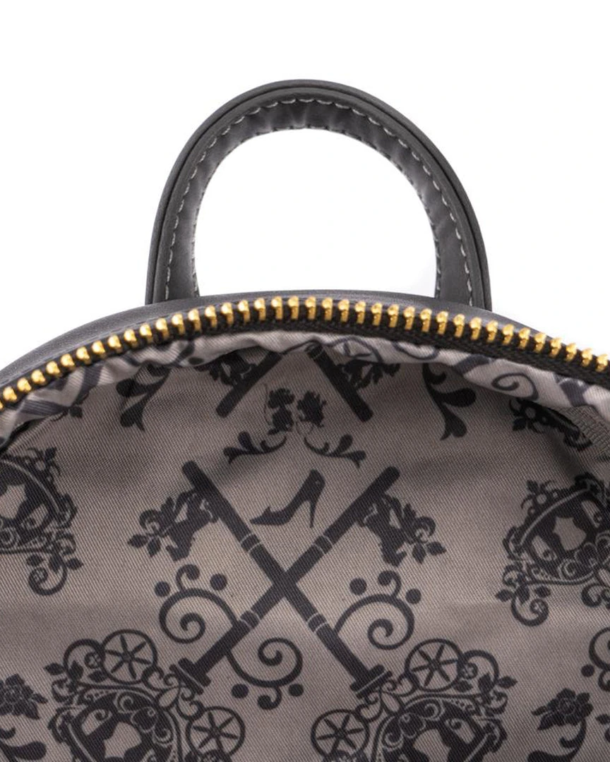 The Loungefly Cinderella Evil Stepmother and Stepsisters Villains Scene Mini Backpack is made of vegan leather (polyurethane). Bag has adjustable shoulder straps, sturdy metal hardware, and features: applique, metallic, and printed details. Take note of the coordinating pattern of the inside lining fabric.