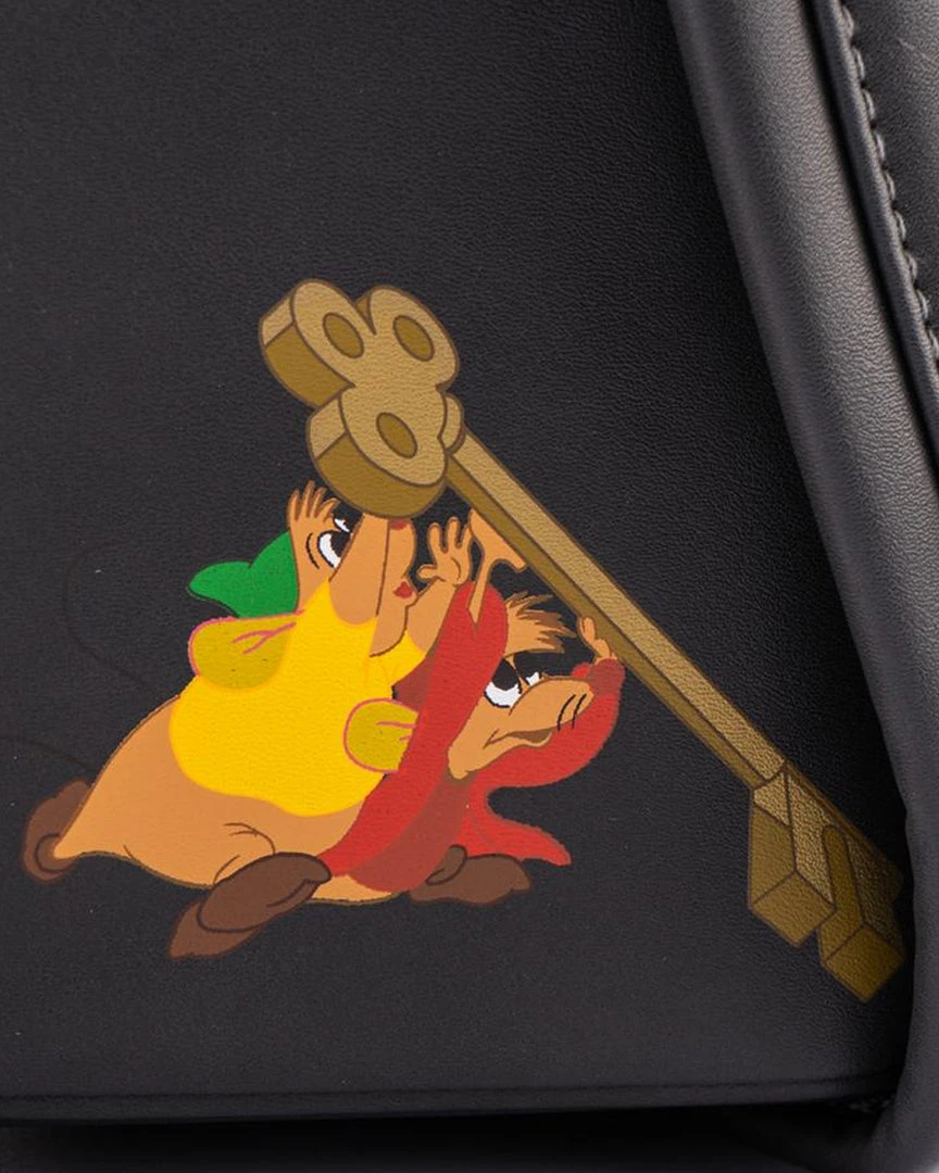 They key to a villainous outfit is the accessories. The Loungefly Cinderella Evil Stepmother and Stepsisters Villains Scene Mini Backpack is here to rule the roost. Through a golden keyhole you’ll find Cinderella, while her stepmother and stepsisters loom over the view with unapproving looks. On the back you’ll find Jaq and Gus carrying the key that may set Cinderella free.