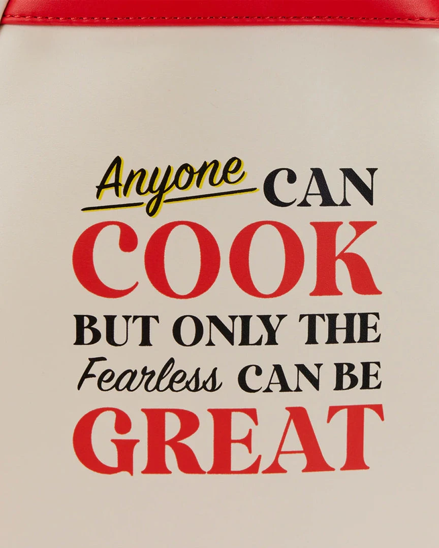 Sumptuous delights are simmering in the kitchen, and the secret to the sauce is under a hat. Capture your favorite animated cooking scenes and show your love for culinary treats with this Loungefly Disney-Pixar Ratatouille 15th Anniversary Linguini Cosplay Mini Backpack. On the front of this backpack, the top of Linguini’s head peaks out, his applique chef’s hat extending beyond the borders of the backpack dome. Turn the lights off, and the secret to Linguini’s success is revealed: Remy’s shape glows from underneath! A hidden pocket is nestled behind Linguini’s hair, topped off with an enamel zipper charm of a wedge of cheese—just for Remy. A side pocket features an adorable print of a wooden spoon and fork. On the back, a debossed message reads, “Anyone can cook, but only the fearless can be great.” This backpack is the perfect accessory for pairing with a Disney outfit, or for turning any outing into a magical and special occasion.