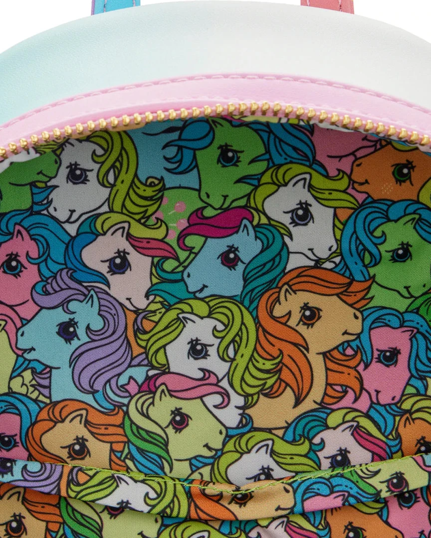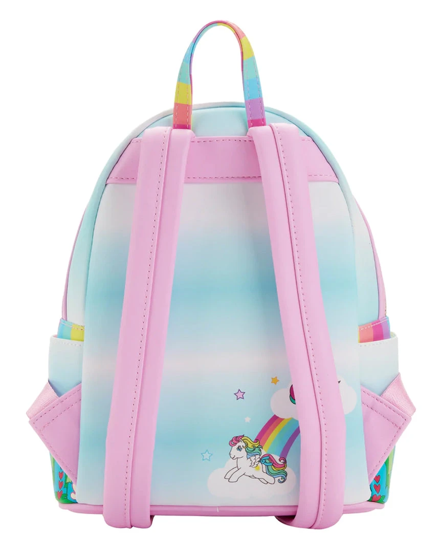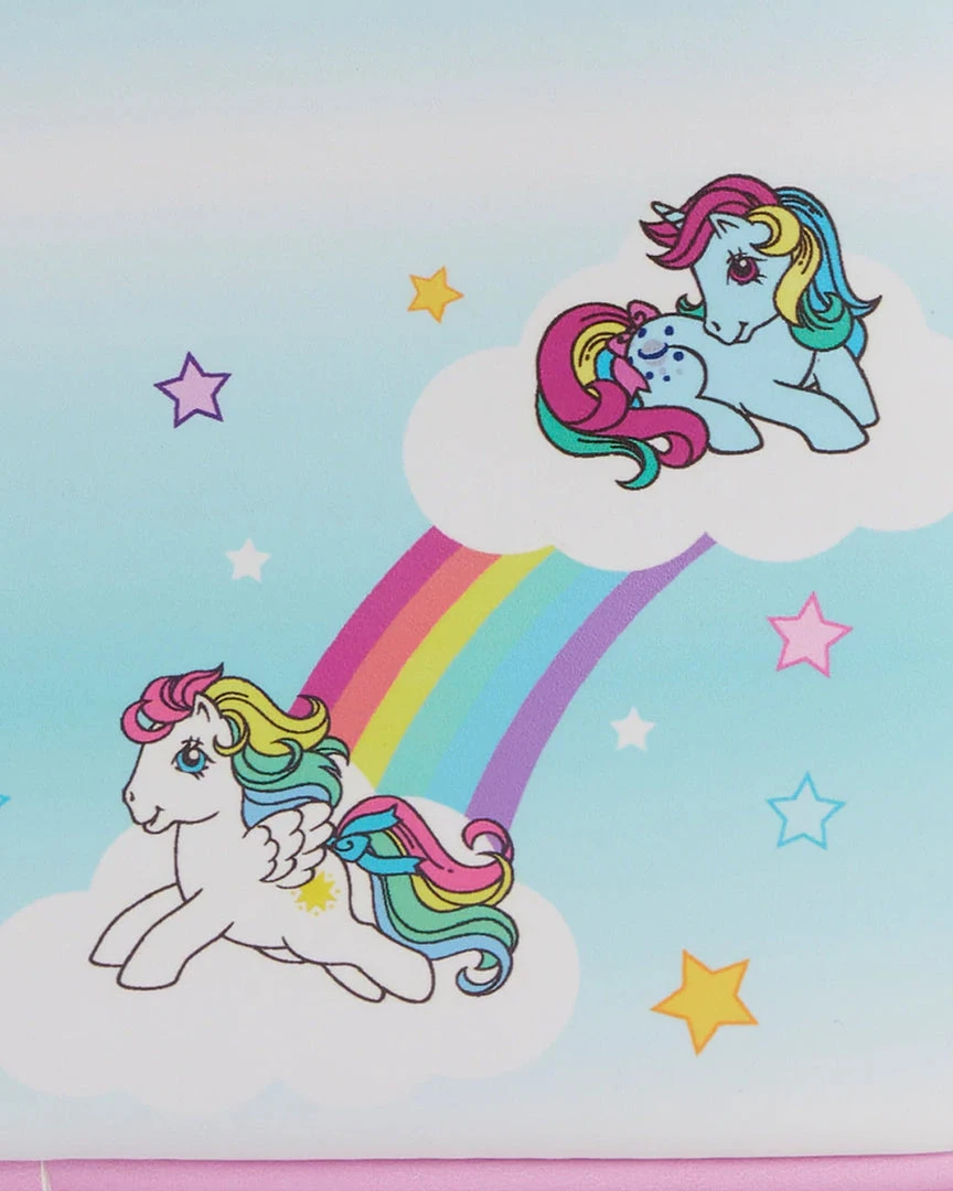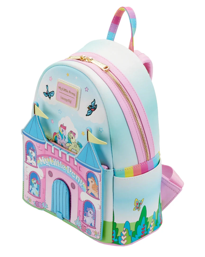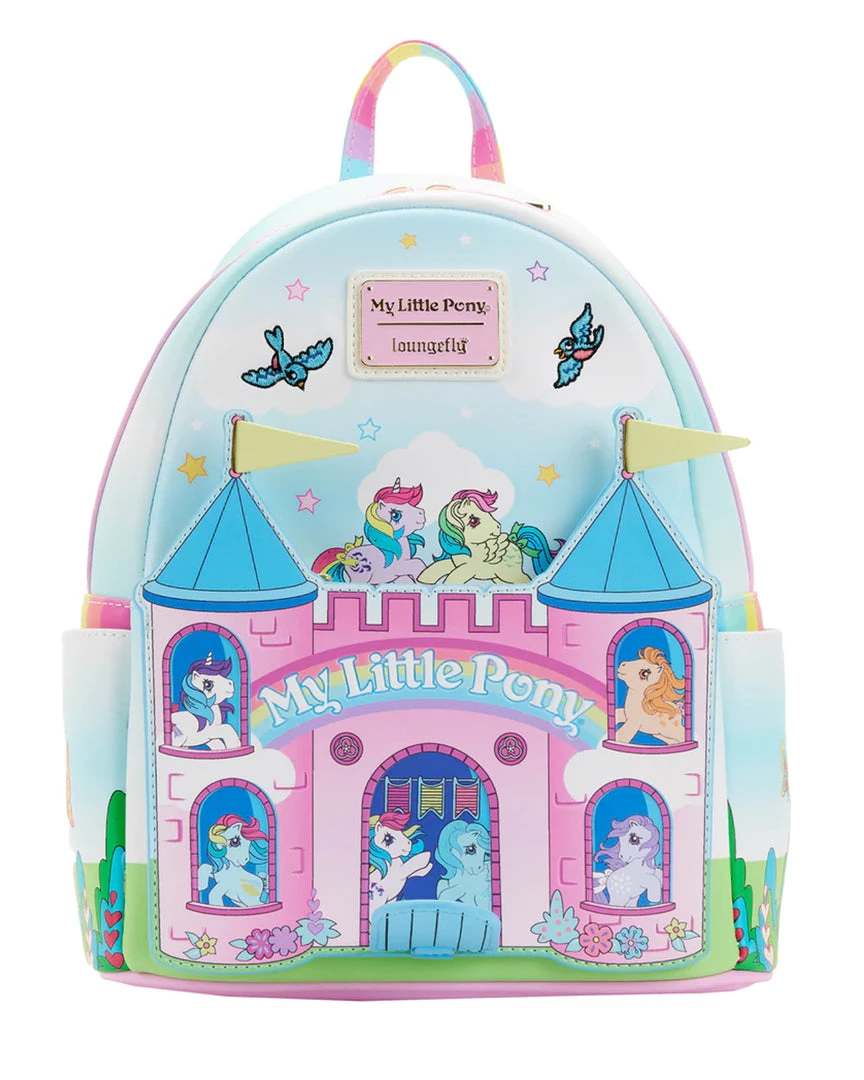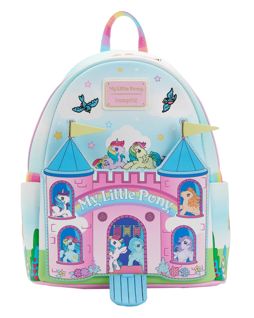 Make each day shine a bit brighter with the magic of a beloved childhood classic. The Loungefly My Little Pony® Castle Mini Backpack is ready to dazzle your collection. This whimsical accessory portrays the Dream Castle where Glory, Windy, Skydancer, Butterscotch, Sunlight, and Blossom have gathered to play. Open the functional drawbridge flap to reveal Parasol and Medley, who are eager to greet you! Two bluebirds fly high in the sky above the castle towers, which include 3D flags. On the back, Starshine and Moonstone appear on clouds surrounded by stars and rainbows. This mini backpack adds a dash of flair to any outfit and is the perfect addition to your My Little Pony collection.