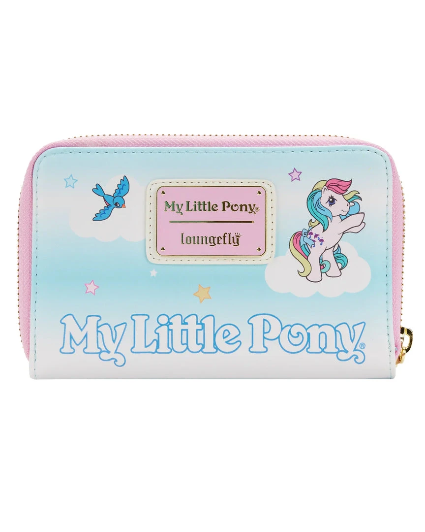 Make each day shine a bit brighter with the magic of a beloved childhood classic. The Loungefly My Little Pony® Zip Around Wallet is ready to dazzle your collection. This whimsical accessory portrays Megan and Skydancer soaring among the clouds. A bluebird flies near the Dream Castle, which rests at the end of a rainbow. On the back, a bluebird flies through the starry sky while Parasol rears on a cloud above the My Little Pony logo. This wallet adds a dash of flair wherever you go as you carry your important items.