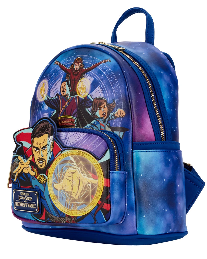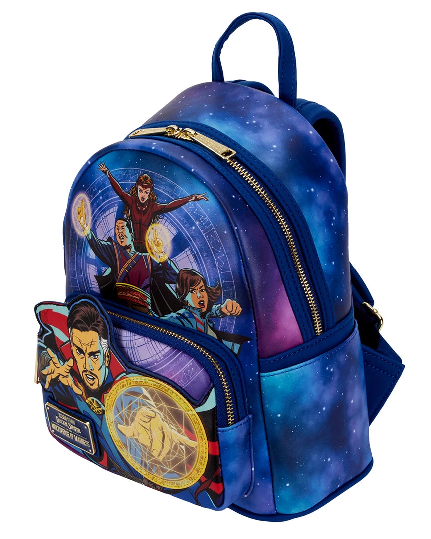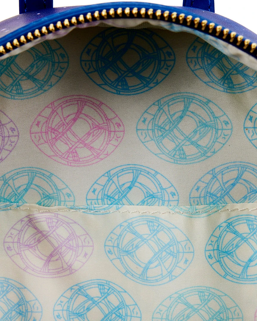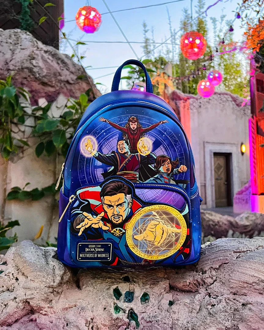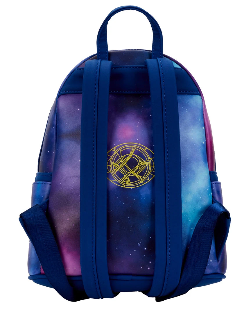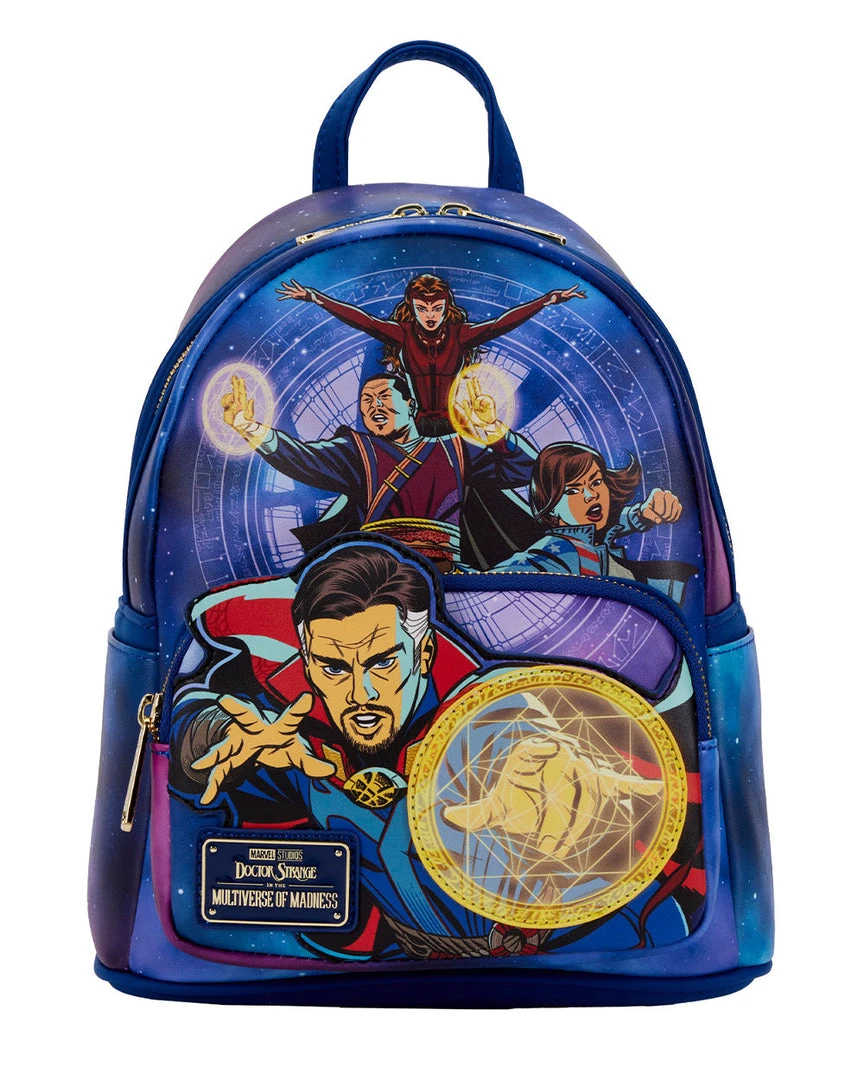 Stop the hands of time to capture this Doctor Strange in the Multiverse of Madness Glow in the Dark Mini Backpack. On the front zipped compartment, Doctor Strange casts a sign that glows green in the dark! Above him, Wong, America Chavez, and The Scarlet Witch use their powers to defend and channel the multiverse. On the back, the Eye of Agamotto appears in gold, floating through space and time, but when the lights go out, it glows green.